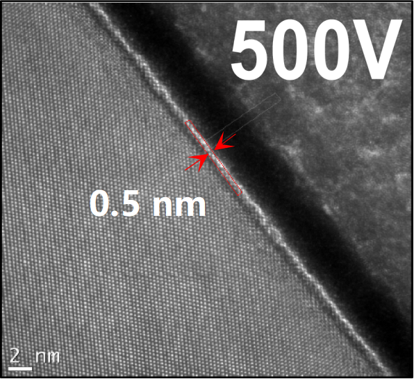 FIB制备TEM样品:0.5keV低电压和0.1pA极低束流抛光保证了样品表面非晶损伤层厚度控制在<1nm像。