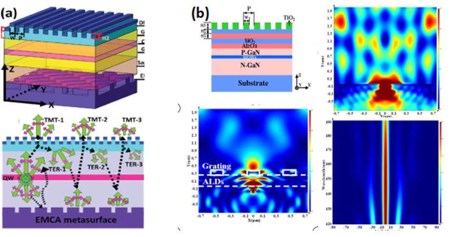 Fig.2 (a)高效线偏振出光LED,Nanoscale (2017) 9, 9104;(b)高效准直出光LED,SPIE (2021), 11894