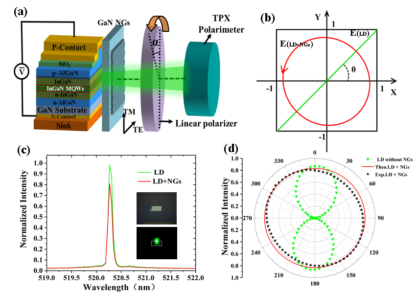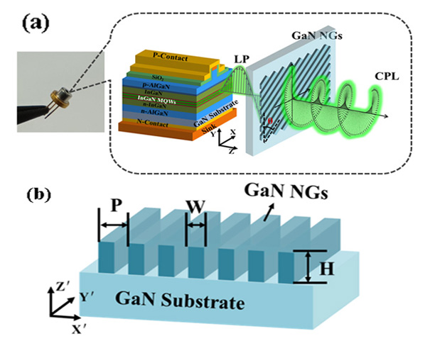 基于氮化镓单晶材料,该团队设计并制备了一种纳米超构光栅,通过数值优化纳米结构横纵向参数(周期、线宽、高度等)和ICP刻蚀,最终成功集成在氮化镓基激光器上实现高效圆偏振出光。
