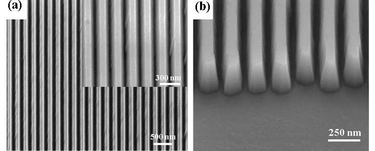 Fig.4 设计并制备的氮化镓纳米超构光栅SEM平面图(a)和截面图(b)