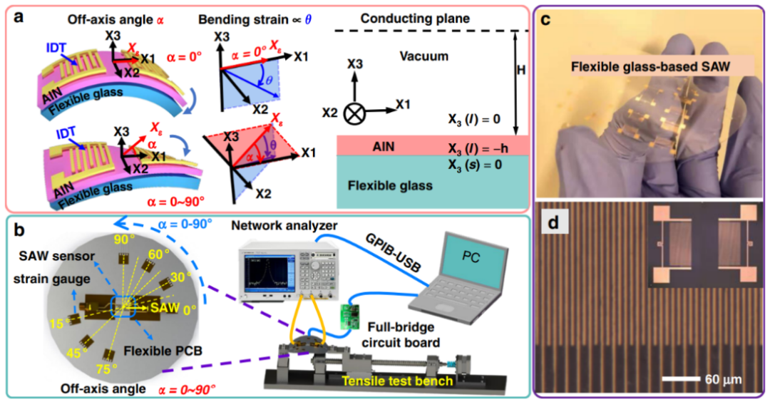 柔性SAW器件弯曲变形和离轴弯曲理论分析示意图及应变测试系统