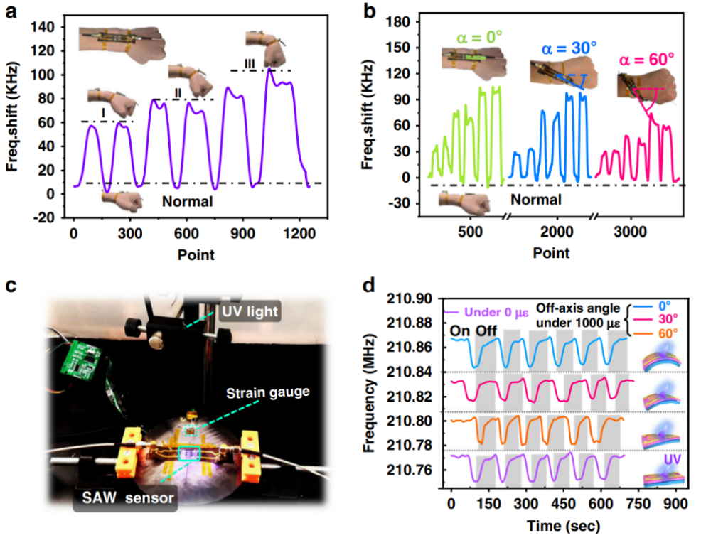 基于柔性超薄玻璃的声表面波器件在人体手腕弯曲应变和离轴紫外探测方面的应用图