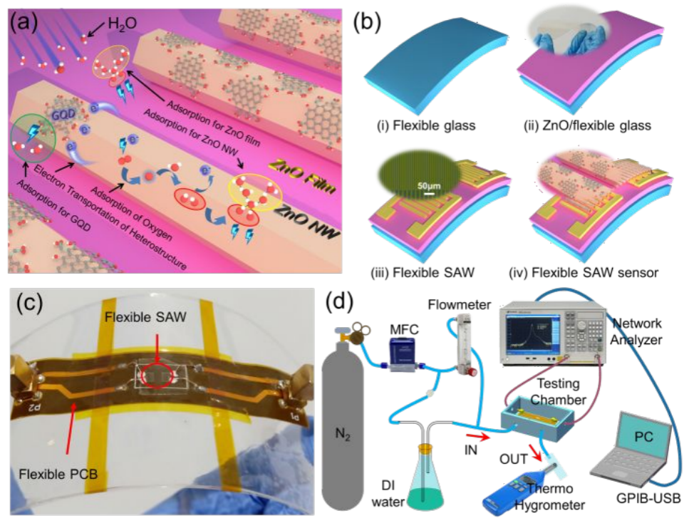(a) H2O分子在复合传感层上的吸附机制示意图;(b) 基于ZnO NWs和GQDs的SAW传感器的制造过程示意图;(c) 封装在聚酰亚胺柔性PCB板上并安装在1毫米厚PET上的器件;(d) 用于湿度感应的测试系统示意图。