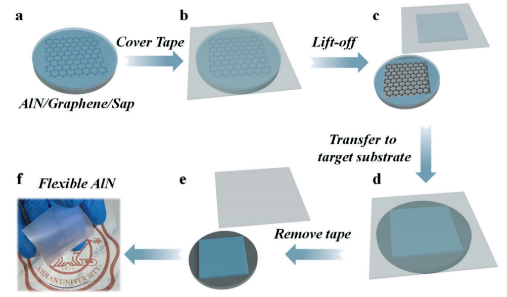 插入石墨烯缓冲层的蓝宝石衬底上制备柔性AlN薄膜的关键步骤示意图