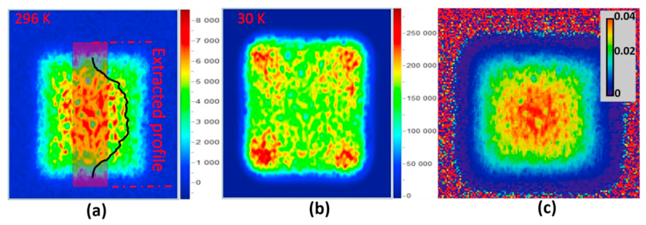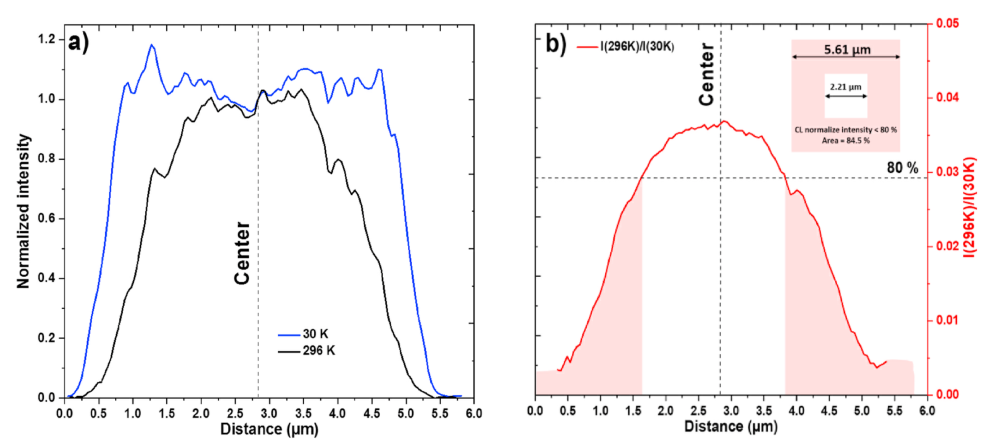 图4. (a)在296K 和30K 下的归一化强度分布; (b)从图3c 中提取的发射效率分布。在插图中,像素受影响区域的简化顶视图表示