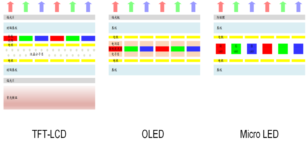 图1.LCD、OLED和Micro-LED 显示面板的结构图[2]