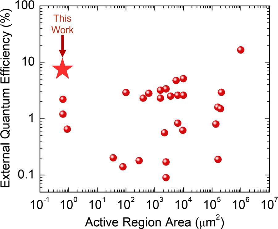 该团队最新研究成果(如图1星标所示),通过优化p型掺杂提高器件发光效率,对于面积为~750x750nm2的红光sub-micro LED,在电流密度 1A/cm2下,可实现8.3%的峰值外量子效率(EQE),插座效率(WPE) 4.6%,这是横向尺寸在1μm2范围或更小的红光LED所报告报道的最高值。