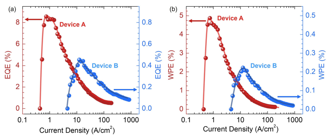 图3:器件A和器件B的(a)EQE和(b)电光转换效率(WPE)随注入电流密度的变化关系