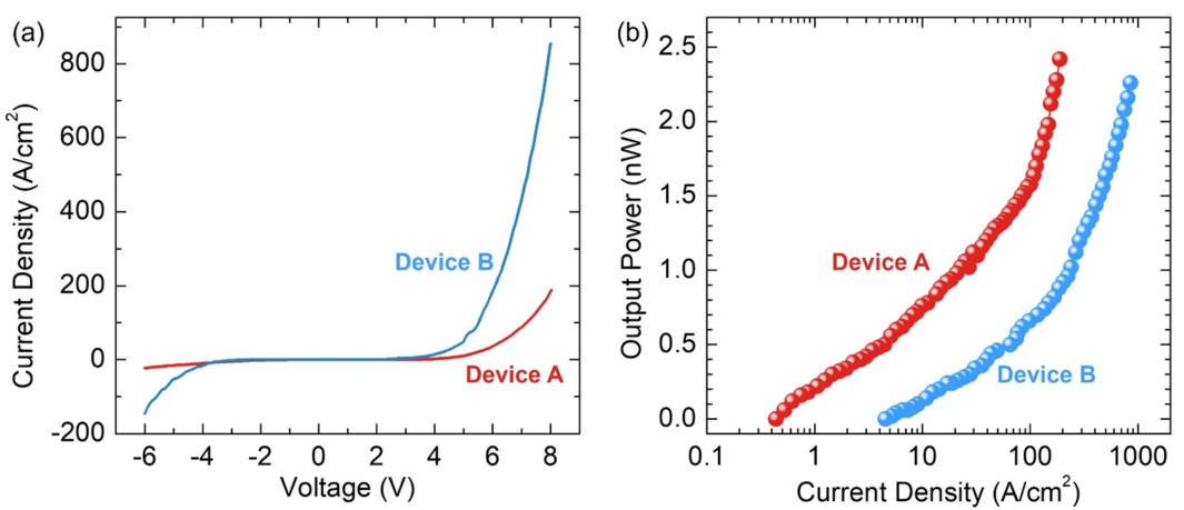 图4:器件A和器件B的(a)J-V特性曲线和(b)L-I特性曲线