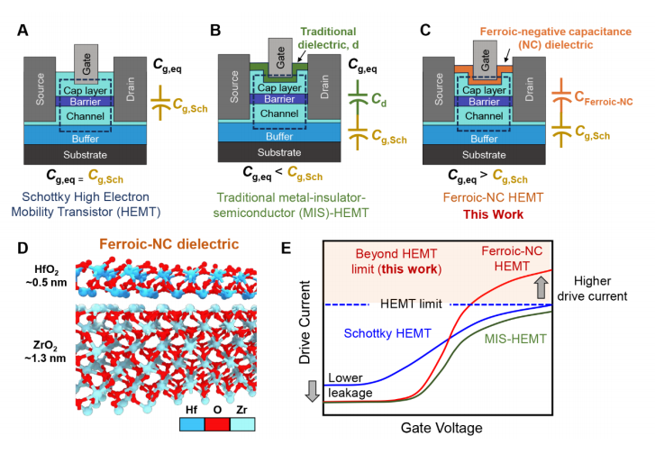 该方案通过引入铁电材料的负电容效应,突破了传统 HEMT 的性能极限。这一成果的意义体现在: