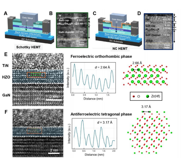 在图2中,肖特基与负电容(NC)GaN HEMT结构及材料表征。(A)制备的肖特基GaN HEMT示意图。"肖特基"指栅金属与凹槽GaN覆盖层之间不存在任何栅介质。(B)钨(W)栅金属下方肖特基HEMT堆栈的透射电镜横截面图像(切割线如(A)中虚线箭头所示),显示约4nm厚的凹槽GaN覆盖层。(C)制备的NC GaN HEMT示意图,在栅金属(W)与凹槽GaN覆盖层之间具有铁电负电容HZO介质。(D)栅金属下方NC HEMT的透射电镜横截面显微图(切割线如(C)中虚线箭头所示),显示在约4nm剩余GaN覆盖层(与肖特基GaN HEMT厚度相同)上存在约1.8nm HZO栅介质。原子级1.8nm厚HZO介质的图像及从橙色框区域提取的d晶面间距表明:(E)萤石结构铁电正交相(Pca21)与(F)反铁电四方相(P42/nmc)共存于同一HZO层中,促进负电容效应的稳定。(E)和(F)中的HZO层采用与器件完全相同的沉积条件,物相归属基于Zr(Hf)的原子构型及其原子间距。铁电正交相(Pca21)沿[100]晶带轴与反铁电四方相(P42/nmc)沿[111]晶带轴的原子构型分别示于(E)和(F)。